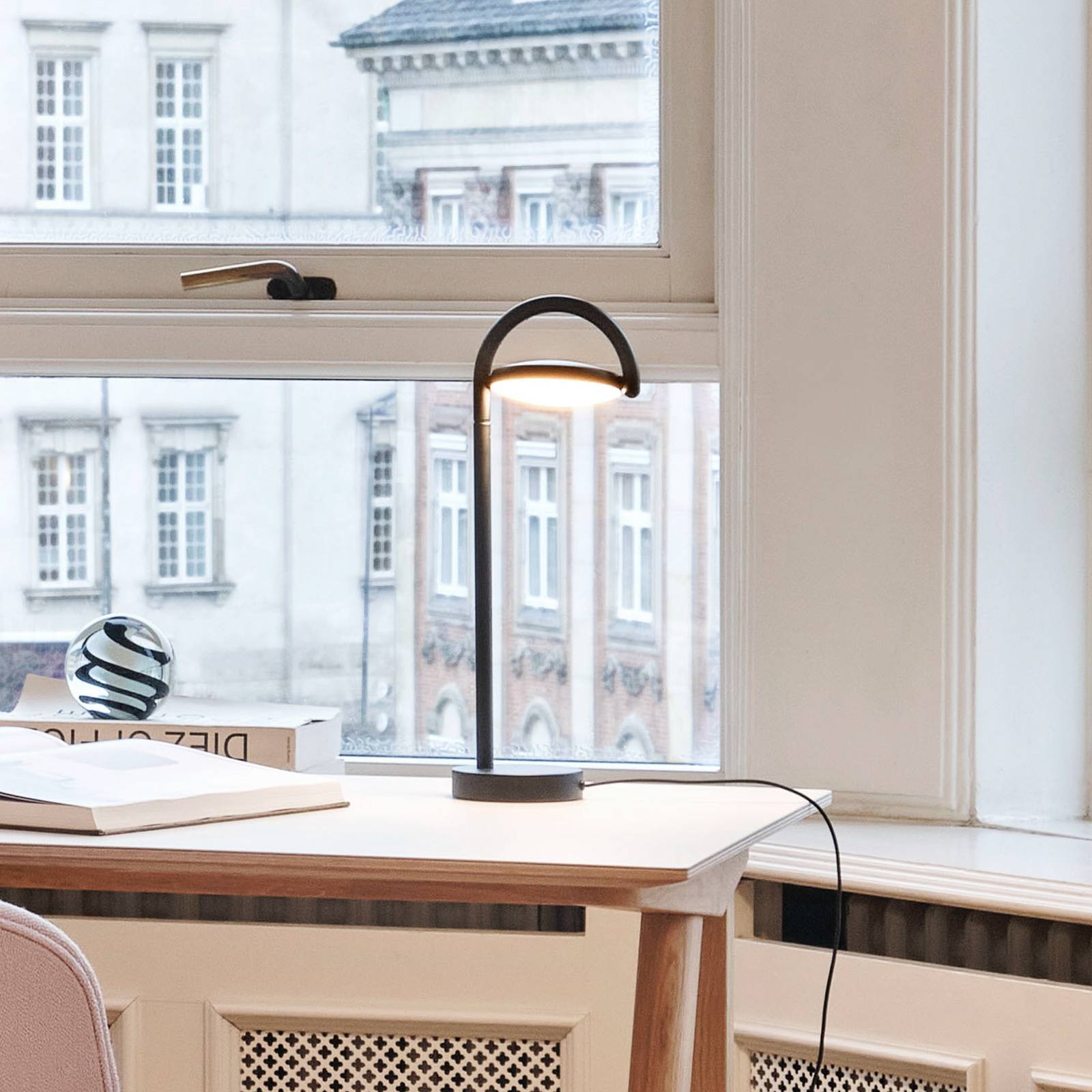 Lampada da tavolo a LED Marselis con testa orientabile Ispirandosi ai tubi curvi delle insegne stradali locali, lo studio di design kaschkasch ha creato la serie di lampade Marselis che condividono queste sagome curve. Nel telaio in alluminio pressofuso e acciaio verniciato a polvere, un disco con LED integrati si trova nella parte superiore della curvatura, coperto da una lente in policarbonato stampato a iniezione. Da un lato, ciò comporta un controllo dell'abbagliamento della luce e, dall'altro, una diffusione uniforme della luce. L'elemento luminoso piatto e rotondo può essere ruotato in curva grazie a due giunti, in modo che l'apparecchio fornisca sia luce diretta che indiretta, a seconda della posizione. Inoltre, l'apparecchio è dotato di un dimmer a sfioramento che può essere utilizzato per variare la luminosità. Lo studio di design kaschkasch, fondato nel 2011 da Florian Kallus e Sebastian Schneider, lavora nei settori dell'ar