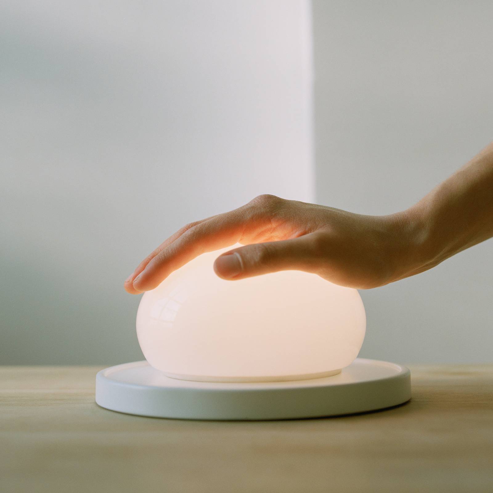 Lampada da tavolo a LED dal design estetico Bolita - Design kaschkasch Con Bolita, Florian Kallus e Sebastian Schneider dello Studio kaschkasch hanno realizzato il loro desiderio di creare un apparecchio di illuminazione nel nostro mondo altamente tecnico che possa essere dimmerato meccanicamente. L'hanno ottenuto brillantemente con il design della lampada da tavolo Bolita LED. Bolita riporta in primo piano il senso del tatto. Sulla base rotonda in acciaio si trova un corpo luminoso in vetro opalino soffiato, in cui sono installati LED di colore bianco caldo. La loro luce può essere attenuata semplicemente muovendo il vetro a mano. L'interruttore di accensione e spegnimento è integrato nella base. - incl. cavo di alimentazione con spina (nero)