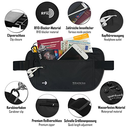Marsupio portasoldi da viaggio nascosto + protezione RFID | Cintura portadocumenti Wilford & Sons + 3 grandi tasche | Sottile, attillato, idrorepellente per denaro, carte, passaporto | Viaggi, sport