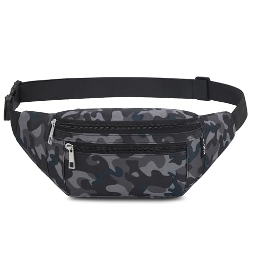 Marsupio Sportivo Uomo Donna Grande con 4 Zip Tasche Cintura Regolabile e Fibbia a Sgancio Rapido, Waist Bag in Nylon Impermeabile per Ciclismo Running Escursionismo Campeggio Concerti (Nero Mimetico)