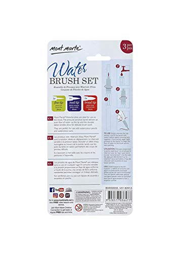 - Il set pennello ad acqua di Mont Marte contiene 3 pennelli con contenitore dell'acqua di diverse dimensioni, perfetti per artisti, studenti, adolescenti e principianti. Questi pennelli ad acqua possono essere utilizzati per una varietà di dipinti e opere d'arte. Sono ideali per acquerelli, inchiostri e vernici solubili in acqua.