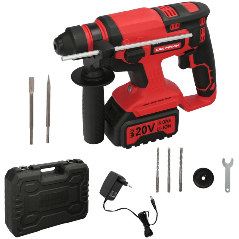 Martello SDS PLUS con motore brushless e batteria al litio da 20 Volt e 4 Ah, progettato per fornire elevate prestazioni nel fai da te e nell'edilizia. Questo martello si distingue per la sua versatilità, poiché dispone di 3 funzioni: scalpellatura, foratura e perforazione a percussione, che lo rendono lo strumento multifunzione per lavori su calcestruzzo, muratura, muri e altro ancora. La velocità a vuoto da 0 a 1.400 giri al minuto e un'energia d'impatto di 1,7 Joule garantiscono un'efficienza ottimale in ogni attività. Inoltre, il mandrino portapunta con sistema SDS PLUS facilita il cambio rapido degli accessori. Grazie al variatore di funzioni è possibile adattare la modalità di lavoro in base alle esigenze di ogni attività. L'impugnatura gommata offre maggiore comfort ed ergonomia durante l'uso. Questo martello SDS PLUS può forare fino a 13 mm nell'acciaio, 28 mm nel legno e 22 mm nel cemento. Inoltre sono inclusi vari accessori come batteria, caricabatterie, punte SDS PLUS di