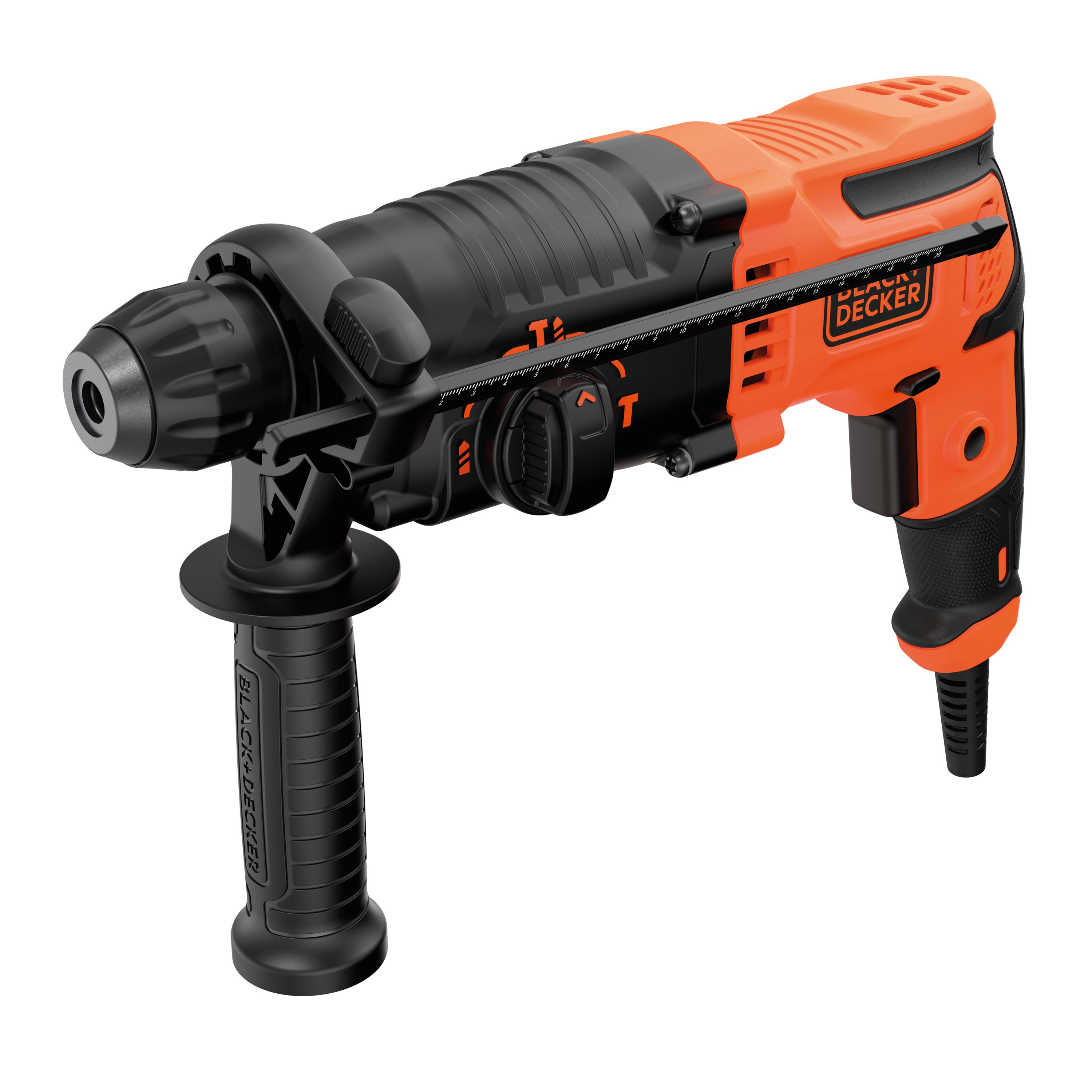 Mandrino SDS Plus, 1,4 Joule, 5600 colpi al minuto, funzione di rotazione, rotazione con percussione, scalpellatura. Massima capacità di foratura su muratura 16mm. Applicazioni di foratura su muratura. Design “finger groove” per le applicazioni che richiedono una maggiore pressione. Selettore di velocità rotante. Tasto “blocco interruttore” e grilletto a 2 dita per un uso prolungato
