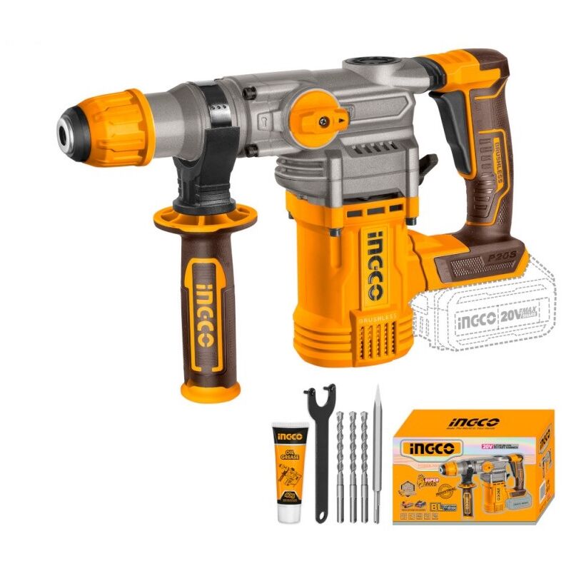 Brushless motor Voltage: 20V No-load speed: 0-930rpm Impact rate: 0-4400bpm Impact energy: 4.5J CAPACITA' MAX FORATURA: PIETRA: 28mm ACCIAIO: 13mm LEGNO: 40mm SDS Plus chuck system Include: 3 PUNTE MURO (8,10,12mm) 1 SCALPELLO PUNTA 1 GRASSO 1 CHIAVE BATTERIA E CARICABATTERIE VENDUTI SEPARATAMENTE COMPATIBILE CON TUTTE LE BATTERIE INGCO Packed by color box