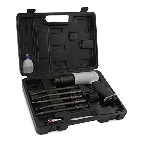 Kit completo con accessori in valigetta di plastica (scalpello piatto, scalpello a punta, scalpello di taglio, taglia estremità tubi e scalpello per la rimozione di bulloni, molla per la rimozione dello scalpello, mini lubrificatore e bottiglia di plastica per olio per utensili)