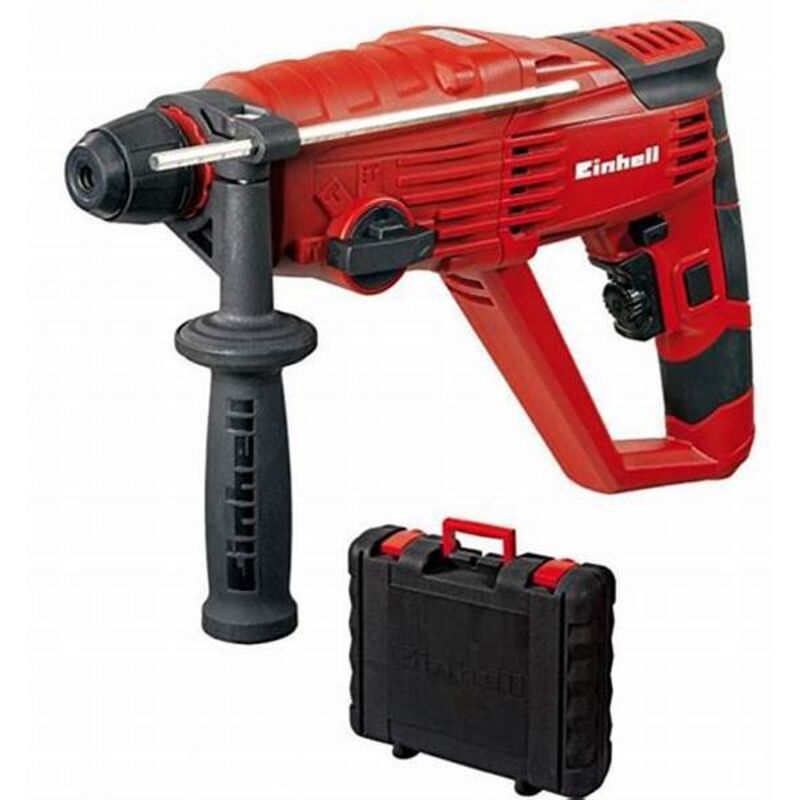 Martello tassellatore TC-RH 800 prodotto dal brand Einhell. Frizione antiscivolo per sovraccarico Attacco SDS-Plus Blocco della rotazione con fissaggio dello scalpello Arresto della percussione Impugnatura antiscivolo Reversibile Regolazione elettronica dei giri con preselettore Protezione per mani Impugnatura supplementare con nervature per impedirne la rotazione Funzionamento silenzioso e a basse vibrazioni. Potenza: 800 Watt Nr. giri: 0 - 1.000 min-1 Percussioni / forza colpo: 0 - 5.180 min-1 / 2,5 J Capacità foratura (muro): 26 mm Guida di profondità in metallo Pratica valigetta