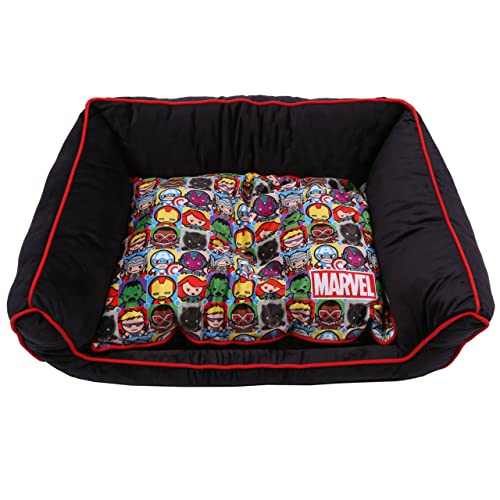 Comodo letto per cani di colore nero con immagini dei supereroi del film "Avengers".