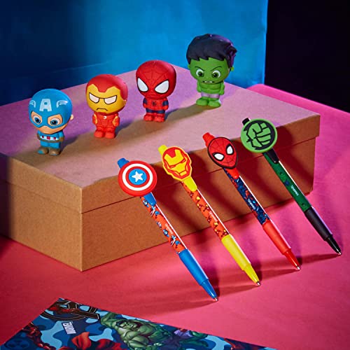 Set 4 pezzi: questo set di penne Marvel include 4 penne a sfera nere con adorabili topper di Captain America, Iron Man, Hulk e Spiderman