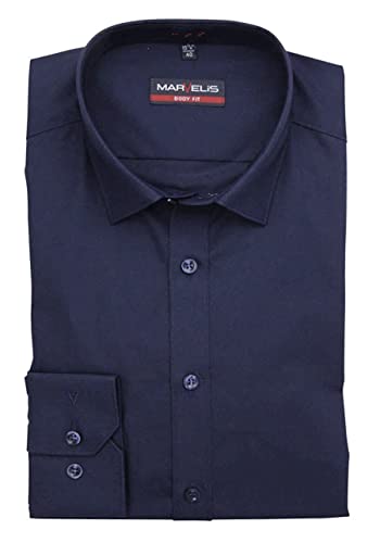 Marvelis Body Fit Camicia a maniche lunghe con 68,5 cm di lunghezza con colletto New Kent e polsini sportivi dal taglio fortemente sciancrato, in puro cotone, tinta unita blu marine