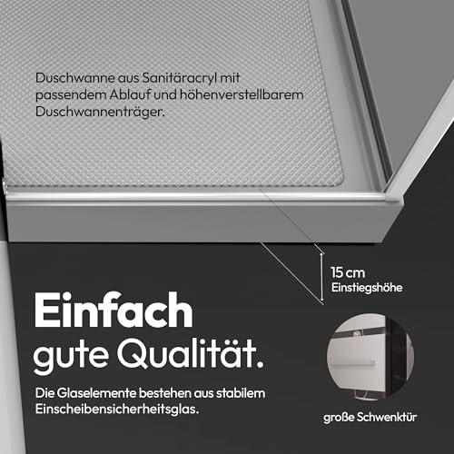 Alta qualità: la nostra doccia completa con telaio in alluminio argentato opaco di alta qualità per un rivestimento uniforme e un'elevata resistenza ai graffi. Con dimensioni 90 x 90 x 225 cm, è perfetto per ogni bagno.