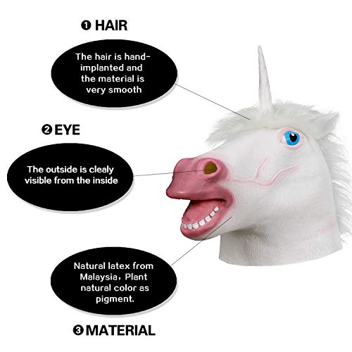Portatevi al nostro costume da unicorno. Questo puntello in lattice di alta qualità è incredibilmente dettagliato con linee del viso, macchie di età e anche. verruche, schiena e cappuccio bianco.