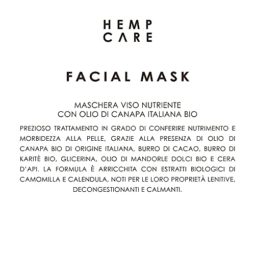 Maschera viso, in grado di conferire nutrimento e morbidezza alla pelle grazie alla presenza di Olio di Canapa Bio di origine italiana, Burro di Cacao, Burro di Karitè Bio, Glicerina, Olio di Mandorle dolci Bio e Cera d'Api.