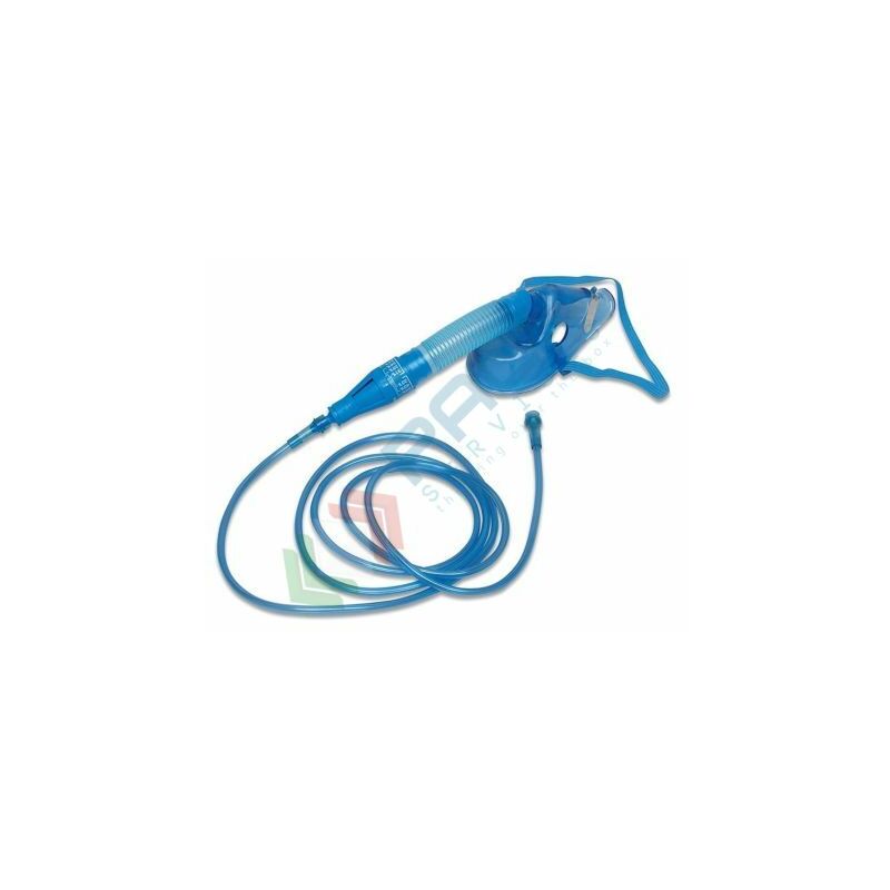 Maschera ossigeno che permette di somministrare concentrazioni di ossigeno variabili dal 24 al 50%. Maschera realizzata in materiale atossico, con elastico clip metallica stringinaso e tubo antischiacciamento da 1,8 mt.