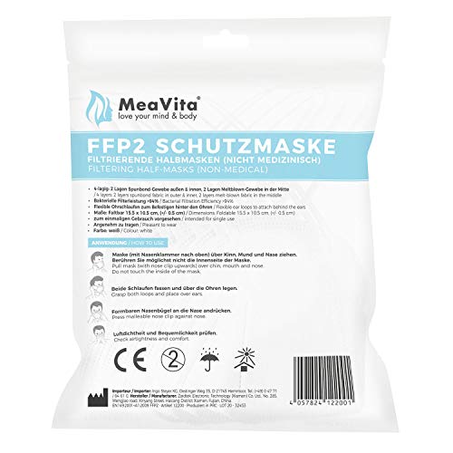 Mea Vita Maschera FFP2, protezione per bocca e naso certificata UE CE secondo EN149:2001+A1:2009, fascia elastica confezione da 20