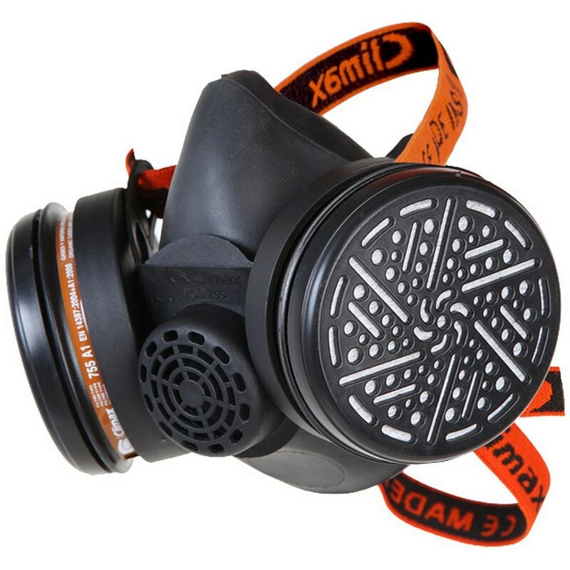 A due filtri. in gomma termoplastica flessibile. con elastici regolabili per un'adesione al volto senza perdite. con due filtri 755 a1 inclusi