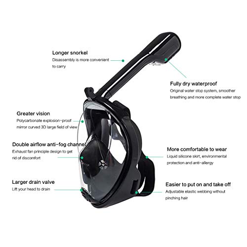 Maschera subacquea e tappi per le orecchie, tubo pieghevole Maschera snorkeling integrale a 180 ° visibile Antiappannamento e antiperdita, supporto per telecamera sportiva rimovibile, respirazione li