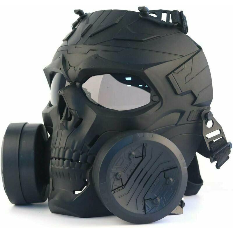 Materiale: poliuretano termoplastico (TPU). Occhiali fumè Taglia unica. Cinturino elastico completamente regolabile. Imbottitura spessa incorporata, uso confortevole e protettivo. Maschera traspirante e resistente Si adatta perfettamente al viso e ha un'imbottitura in EVA molto confortevole. Sistema di circolazione integrato.Utilizza 4 batterie AA per far funzionare la ventola interna (non inclusa ) Nota: questa è solo una finta maschera antigas, solo per giochi di guerra o cosplay. Nessuna funzione di filtro del gas