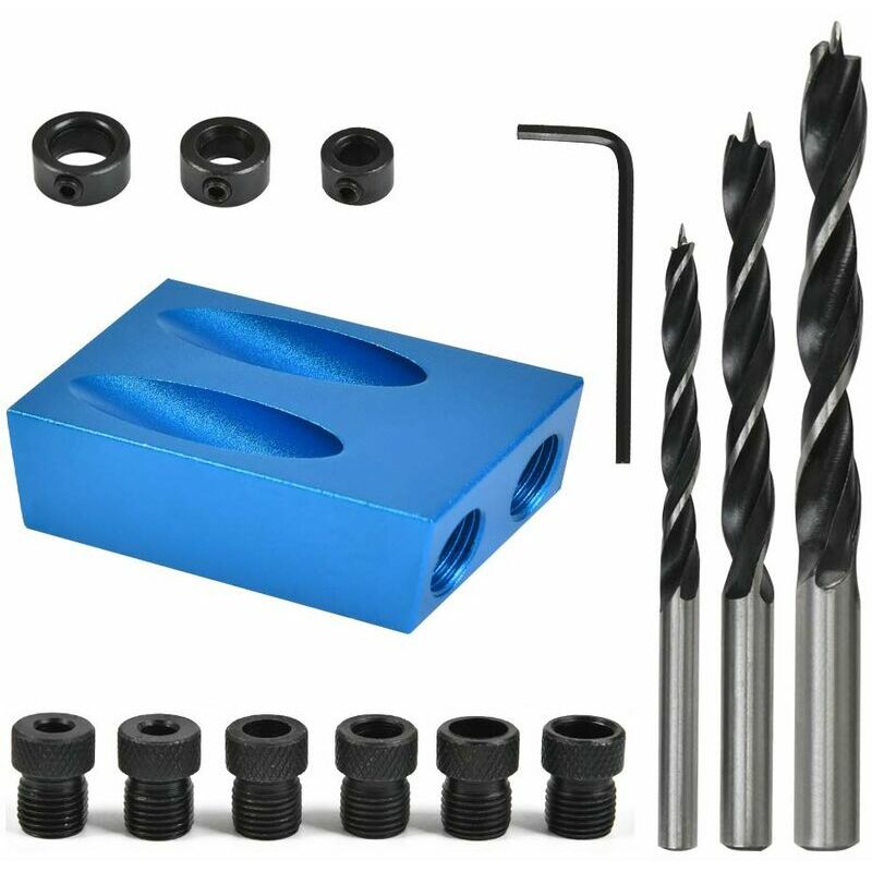 Calibro per fori tascabili, set di punte da trapano per tasselli da 15 gradi Guide per la lavorazione del legno Strumento per angoli di giunzione con adattatore per fori da 6/8/10 mm Set di strumenti per la lavorazione del legno fai da te (14 pezzi/set) Kit di maschere per fori tascabili angolati con adattatore per fori da 6/8/10 mm per guida per trapano ad angolo per la lavorazione del legno Dispositivo per fori tascabili, guida per falegnameria posizionatore di fori obliqui a 15°, lega di alluminio Localizzatore di fori obliqui con adattatore per fori da 6/8/10 mm Dima per fori tascabili Tasselli Kit di dime per fori tascabili 15° 6/8/10 mm Attrezzo angolare per carpentieri per guide di falegnameria Tasca a doppio foro Kit maschera per fori . Non sarà facile arrugginire e danneggiare. L'adattatore per trapano da 6/8/10 mm può soddisfare le diverse esigenze di perforazione e cambiare rapidamente l'adattatore. Specifiche Materiale: acciaio legato + acciaio al carbonio Angolo: 15 gradi