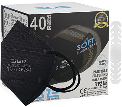 ESZE Mascherine FFP2, 40 Mascherine FFP2 Nere certificate CE made in UE, Mascherine FFP2 Nere Confezionate Singolarmente, Fpp 2, FFP2 con 5 Ganci Salvaorecchie - Certificate CE 2841 BFE >97%