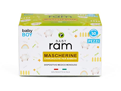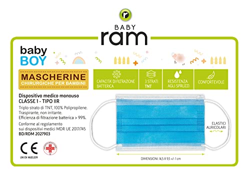 BABY ram 50 Mascherine Chirurgiche per Bambini Colorate - Certificate CE, Made in Italy - 5 Colori Azzurro
