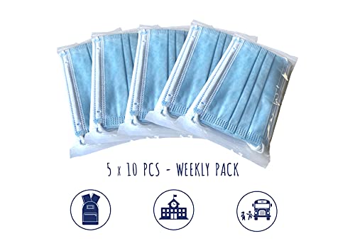 Confezione da 50 pezzi: 5 bustine sigillate da 10 maschere per bambini per un'igiene rispettata e un prodotto inodore. La bustina da 10 maschere è un formato ideale per la settimana.