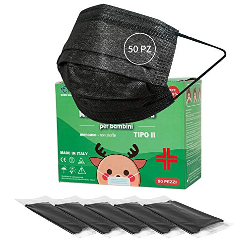 €MSK Mascherine Chirurgiche Colorate Per Bambini,50 Pezzi,Mascherina Bambina Certificate CE,Tipo II,Triplo Strato Filtrante BFE>99%,Traspirante E Morbide,Imbustate Singolarmente-Made In Italy (nero)