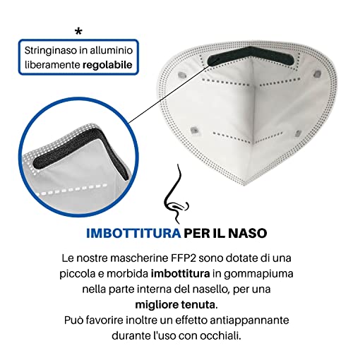 ✅ SICUREZZA e AFFIDABILITA': Le nostre mascherine FFP2 NR monouso sono altamente filtranti (BFE ≥ 95%) e risultano perfette per la protezione da polvere, polline e altre particelle solide e organiche. Vengono fabbricate e sottoposte a sanificazione UV seguendo i più alti standard di sicurezza europei e internazionali in materia di dispositivi medici, in modo da offrirti un prodotto sicuro ed efficace