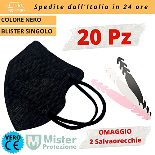 20 Mascherine Small Nere FFP2 in TNT a 5 strati CE1463 Made in Europa sigillate singolarmente - Misure cm 10x12,5 in OMAGGIO 2 elastici salvaorecchie