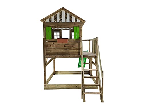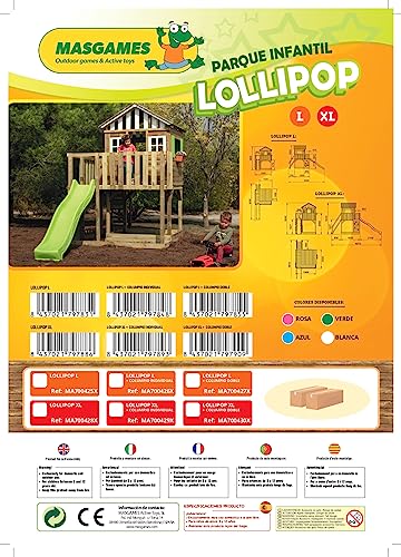 MASGAMES | Parco giochi Lollipop | Casetta rialzata con scivolo | Scala di facile accesso | Parete da arrampicata | Legno trattato per esterno | (L)