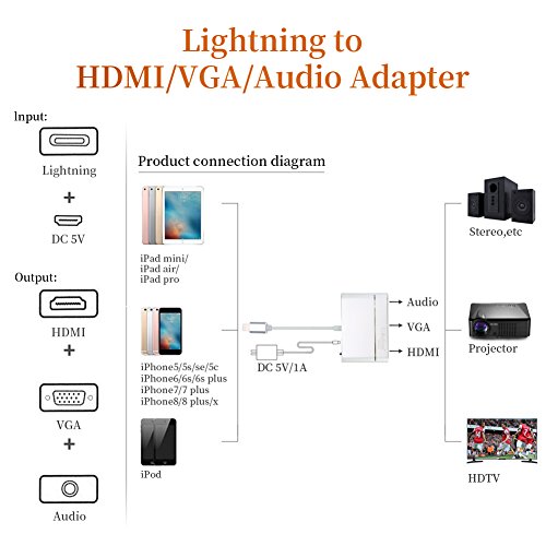 MASOMRUN Cavo convertitore 3-in-1 da Light ning a 8-pin a Multi-Port Digital AV, HDMI, VGA e adattatori audio, cavo di ricarica USB e porta audio da 3,5 mm per iPhone X/8/7/6 e iPad MINI