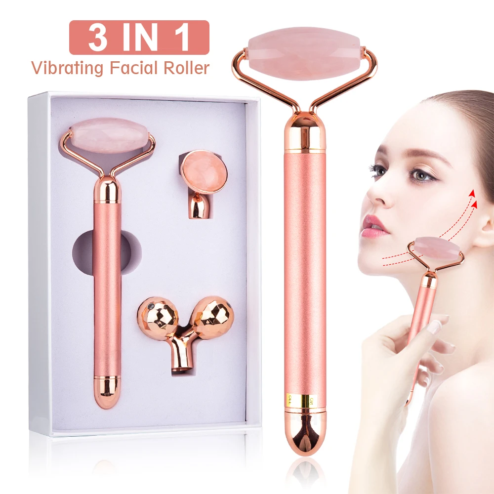 3 In 1 Massage Jade Roller Rose Quartz Pink Electric Face Slimming Facial Massager Skin Relaxation Care Beauty Massage Tool Set