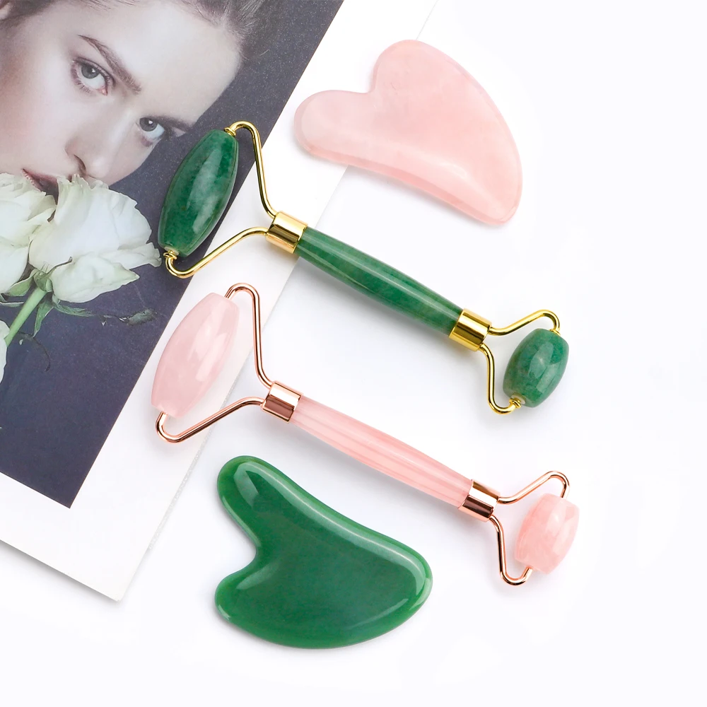 Face Lift Massager Quartz Jade Roller Heart Guasha Scraping Board Facial Massage Natural Jade Stone Roller Skin Care Tools Set