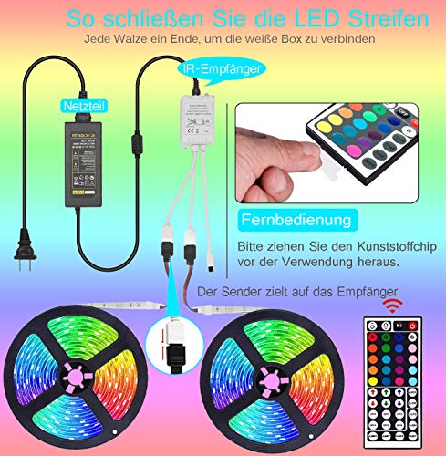 Più colori e modalità: striscia LED RGB con telecomando IR a 44 tasti, la portata del telecomando è di 5 m fino a 7 m. Opzione di 20 colori, 6 modalità fai da te, 2 modalità di salto, 2 modalità di abbagliamento, auto e flash, lampeggiante veloce e lento. Ideale per l'illuminazione e decorazioni, per personalizzare il tuo colore preferito e decorare la tua stanza.
