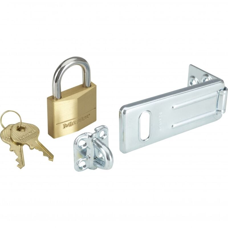 Il modello Master Lock N° 140703EURD comprende un lucchetto a chiave in ottone di 40 mm e un chiavistello di 89 mm in acciaio temprato zincato per una maggiore robustezza e resistenza alla corrosione Set para uso interno, ideale da mettere in sicurezza mobiletti, unità di stoccaggio nei seminterrati, armadietti di scuole, aziende e palestre L'archetto e la piastra di bloccaggio in acciaio temprato resistono al taglio L'archetto del lucchetto, con un diametro di 6 mm, è realizzato in acciaio temprato nichelato per offrire una maggiore resistenza al taglio In quanto marchio di fiducia, Master Lock offre la garanzia limitata a vita