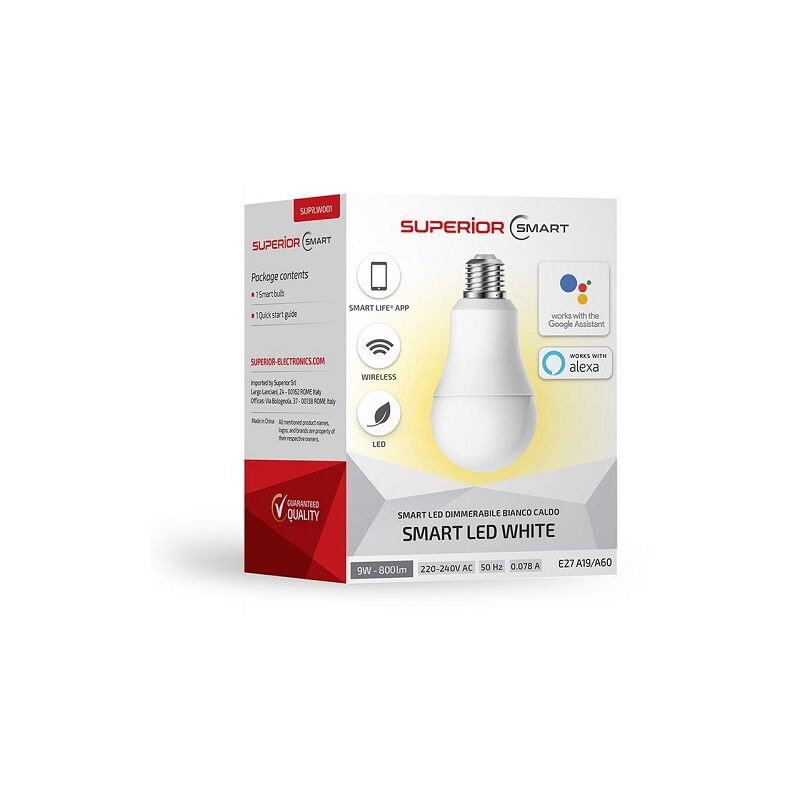 Lampadina Smart LED Bianco caldo dimmerabile • Wireless • Compatibile con Alexa e Google Assistant • Consumi ridotti • Controllabile direttamente dallo smartphone Lampadina Smart LED Bianco caldo dimmerabile Consumi ridotti del 90% rispetto a una lampadina tradizionale a incandescenza. Controllabile da smartphone tramite l'applicazione Smart Life® per iOS® e Android®. Colore luce:Bianco caldo dimmerabile (3000K) Compatibile con Alexa e Google Assistant Wireless Luminosità massima istantanea Non richiede hub IPO: Lampadina Smart LED Bianco caldo dimmerabile DATI TECNICI: Durata stimata: 15.000 ore Timer giornaliero/settimanale Attacco standard E27 - A60 10W - 800lm Classe energetica: A+ CONFIGURAZIONE: Funziona subito, basta collegarla all'applicazione Android® o iOS® CONTENUTO CONFEZIONE: Lampadina, istruzioni e garanzia di 2 anni