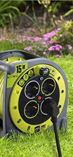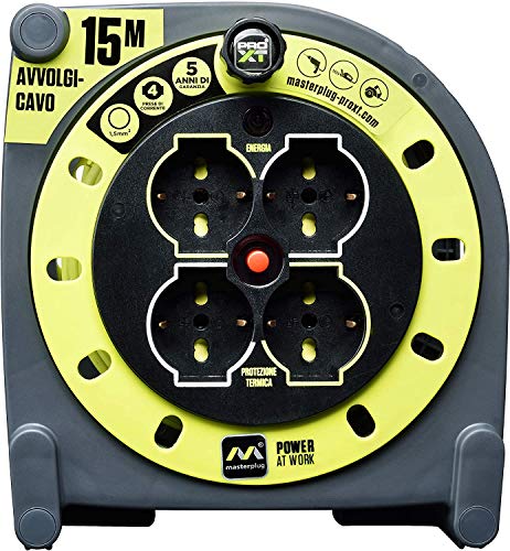 Masterplug Pro-XT Avvolgicavo 15 metri, 4 Prese Universali prolivalent: Bipasso, EU, Schuko, Prolunga Elettrica 16A, Indicatore LED, Cavo Alta Visibilità