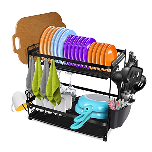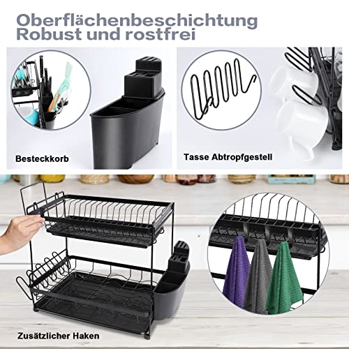 Masthome Scolapiatti da Appoggio,2 Livelli Sgocciolatoio con Portaposate,Portabicchieri, Scolapiatti da Lavello in Acciaio Inox per Cucina e Fornelli di Posate, 1 Panno per La Pulizia,Nero