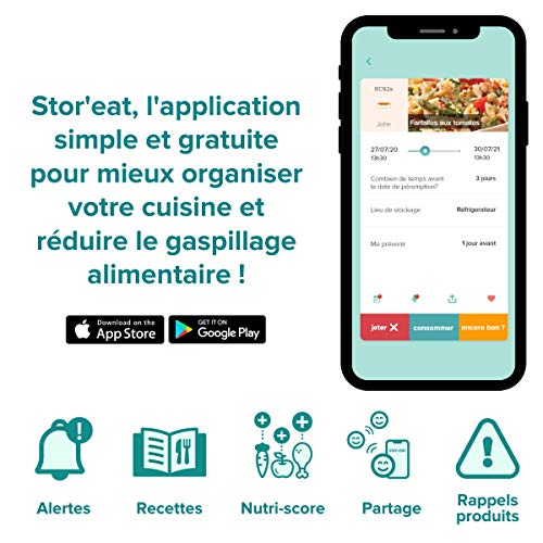 HALTE AL GASPILLAGGIO ALIMENTARE: Accedi all'app Stor'eat con il Flashcode fornito e accedi a colpo d'occhio a tutte le informazioni sulla conservazione degli alimenti contenuti nel barattolo e persino alle idee ricetta per utilizzare gli alimenti che scadono!