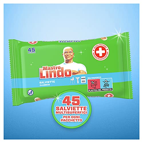 Mastro Lindo Salviette Igienizzanti Multisuperficie, 270 Salviette (6 Confezioni da 45), Classico, Per Tutte le Superfici, Senza Risciaquo, Fresco Profumo di Pulito, Maxi Formato