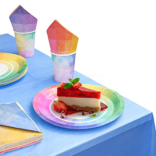 Set di stoviglie per feste - Il nostro set di stoviglie da tavola dai vivaci colori arcobaleno contiene 15 bicchieri, 15 piatti, 30 tovaglioli a 2 strati e una grande tovaglia. perfetto per i compleanni di ragazze e ragazzi.