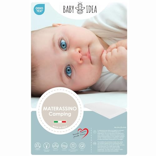Baby idea Materasso Lettino da Campeggio Universale Sfoderabile Pieghevole Antisoffoco Federa Cotone 100% Oeko Tex Certi Pur a Norma EN 16890:2017 Pratica Borsa Viaggio Made in Italy (60x120X4 Bianco)