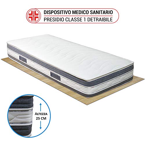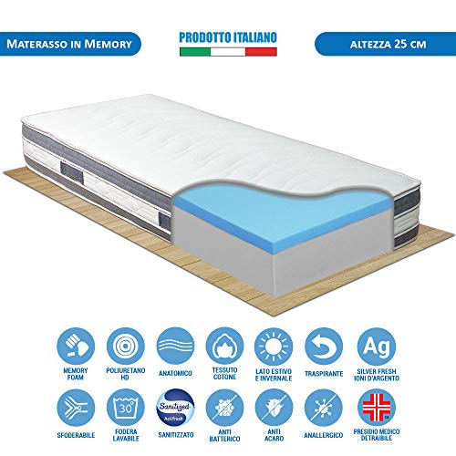 Materasso singolo memory foam 80x190 MALAGA, con ioni d'argento e Magnetoterapia, sfoderabile alto 25 cm con memory da 5cm, materasso letto singolo memory lato estivo/invernale