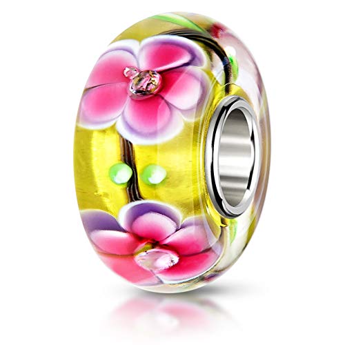 MATERIA Perle di Murano a forma di fiore con 3 zirconi - argento 925 in vetro di Murano con elementi di zirconi in giallo, verde, rosa #1449