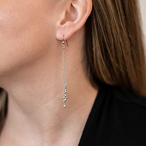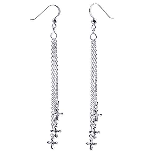 Eleganti orecchini lunghi in argento con tre sottili catene a ancora e tre croci. Gli orecchini sono realizzati in argento sterling 925.