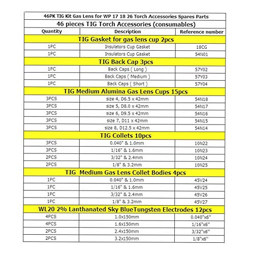 Materiali di consumo Torch Tig, 46 pezzi/set Serie WP-17/18/26 Torcia TIG Accessori per consumabili