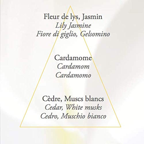 Il profumo incantevole di giglio si mescola al gelsomino fresco, scintillante in un cuore speziato di cardamomo, infine in una graziosa base di cedro e muschi bianchi.