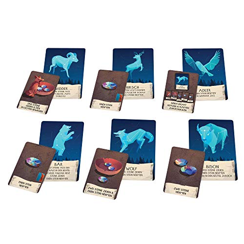 Un divertente gioco di strategia, progettato specificamente per 2 giocatori. Include una ciotola, 1 zampa di Kojota, 56 pietre da gioco in 7 colori, 1 sacchetto in tessuto, 2 tavolette da gioco, 12 carte d'azione e 6 carte magiche d'azione.