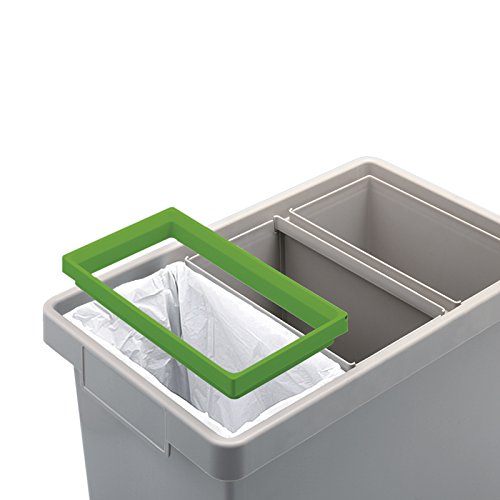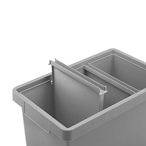 Contenitore da 40 litri totali dotato di due divisori interni, due anelli ferma-sacco e coperchi di colore giallo e blu e, in aggiunta, un contenitore aerato da 6 litri di colore marrone completo di coperchio e manigliette con funzione ferma-sacco/trasporto per raccogliere l'umido in cucina con i sacchi compostabili (dimensioni ideali per utilizzo con i sacchi ortofrutta)