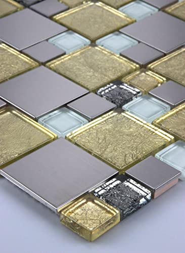 11 mattonelle a mosaico in vetro, 1 m², in acciaio inox, oro e argento, bianco, 30 x 30 cm, 8 mm