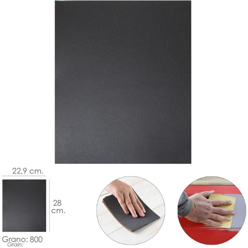 Carta vetrata ad acqua grana 800 - Grana: 800. - Dimensione foglio: 28x22,9 cm - Abrasivo: carburo di silicio. - Applicazioni in metallo, laccatura, riparazione carrozzeria e plastica . - Articolo noto come carta vetrata ad acqua, carta ad acqua, carta vetrata per il corpo, carta vetrata per bodybuilder.